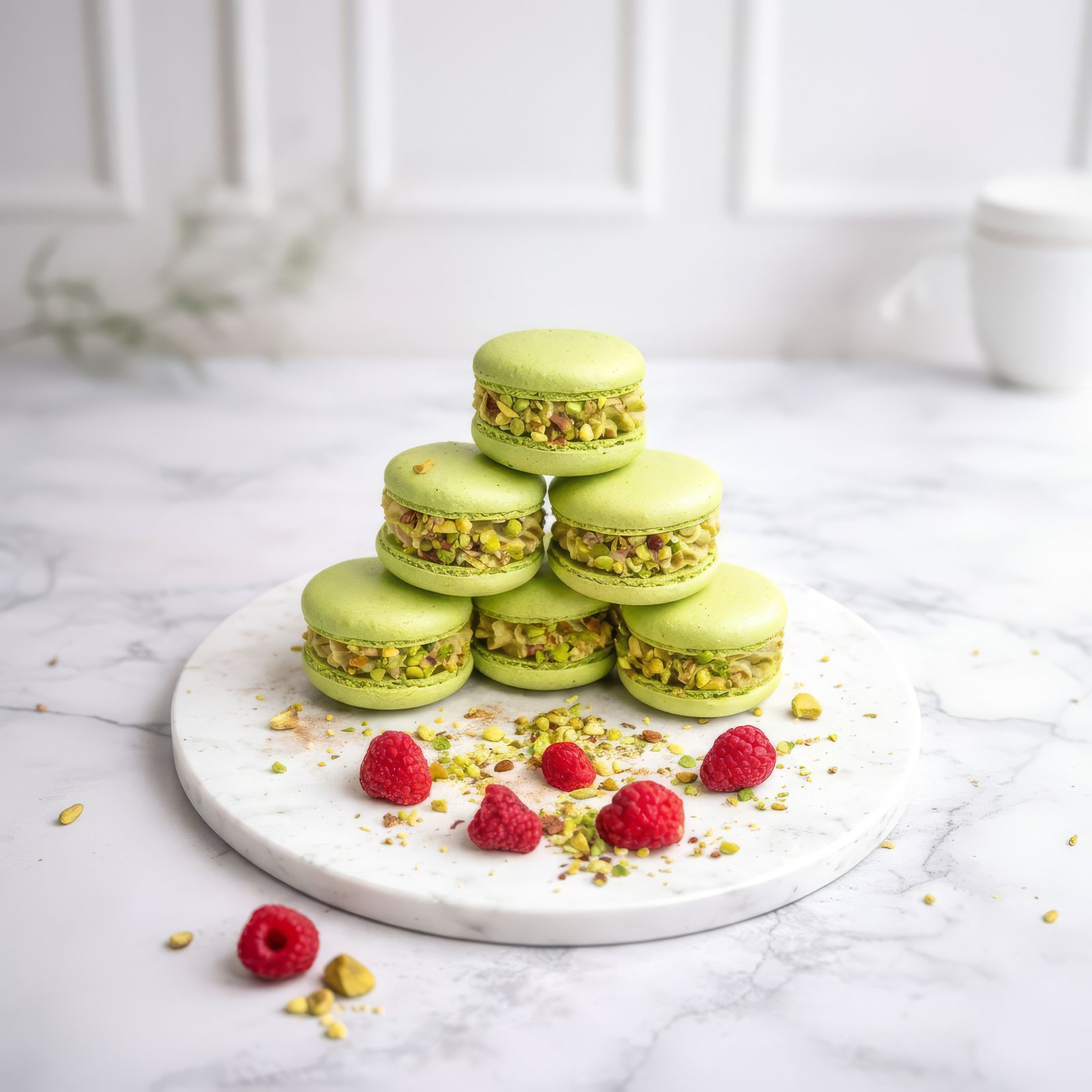 М'якi мигдальні кришечки з фісташковим акцентом. Ніжний ганаш із шоколаду та вершків 33% з натуральною фісташковою пастою і малинове пюре всерередині.